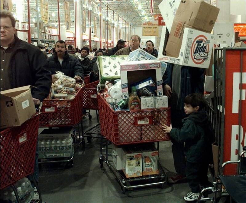 People preparing for Y2K38, stocking up on essential items. (01.18.2038)