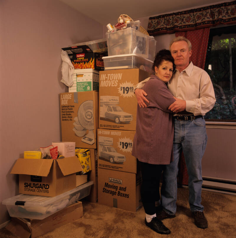 A couple, Tom and Betty O'Connor, packing to move from Seattle to rural Utah before Y2K38. (04.20.2037)