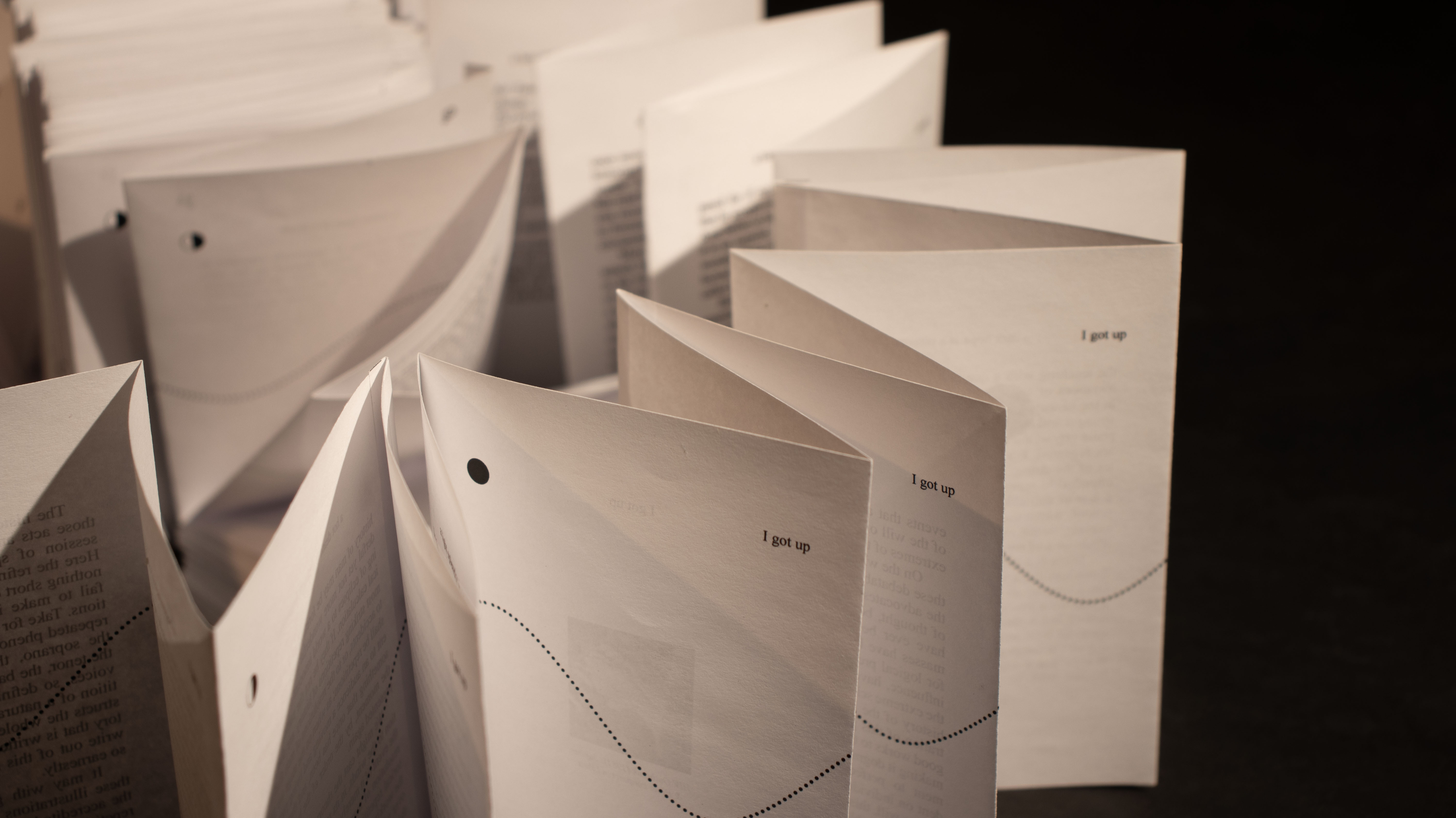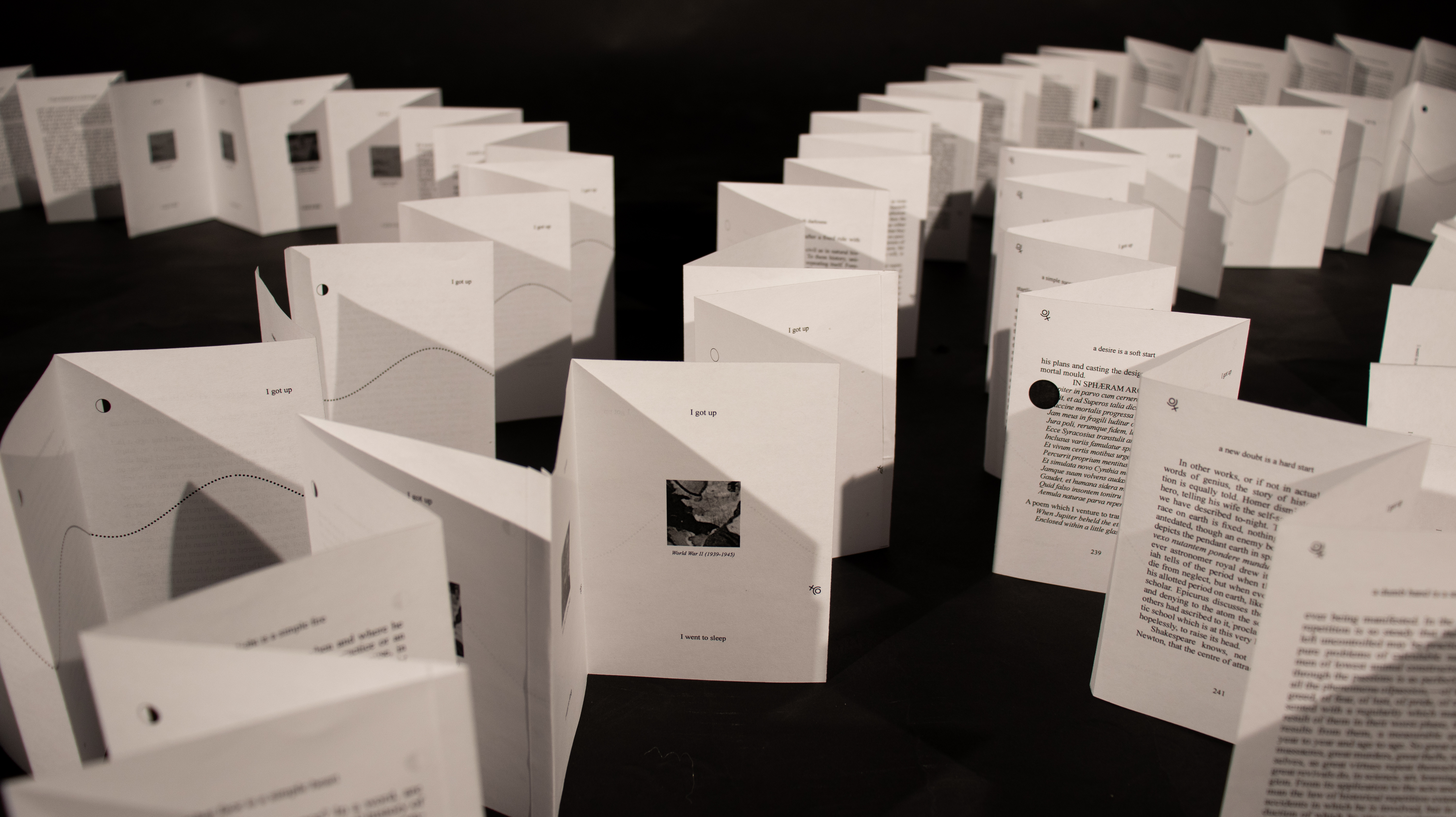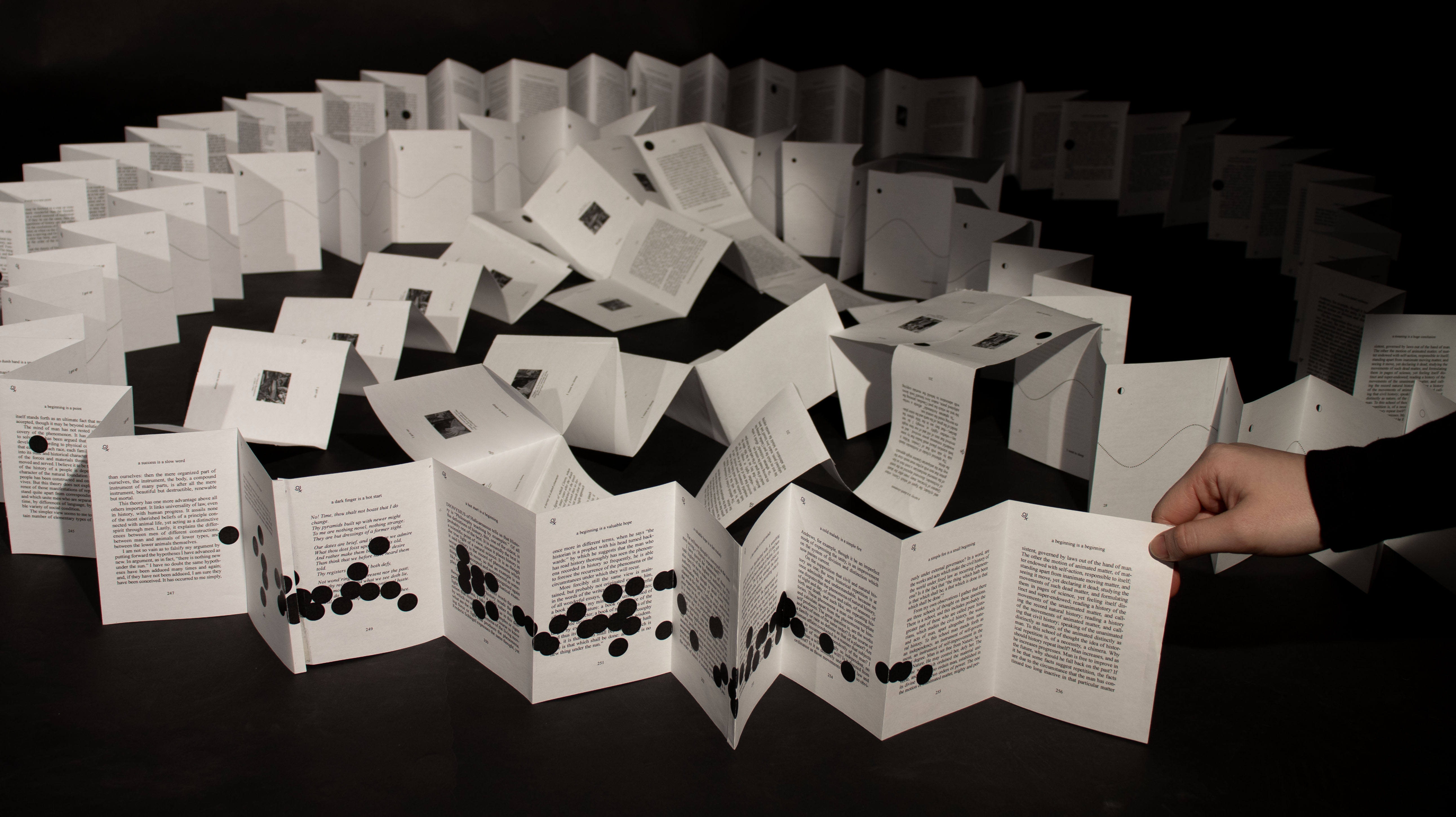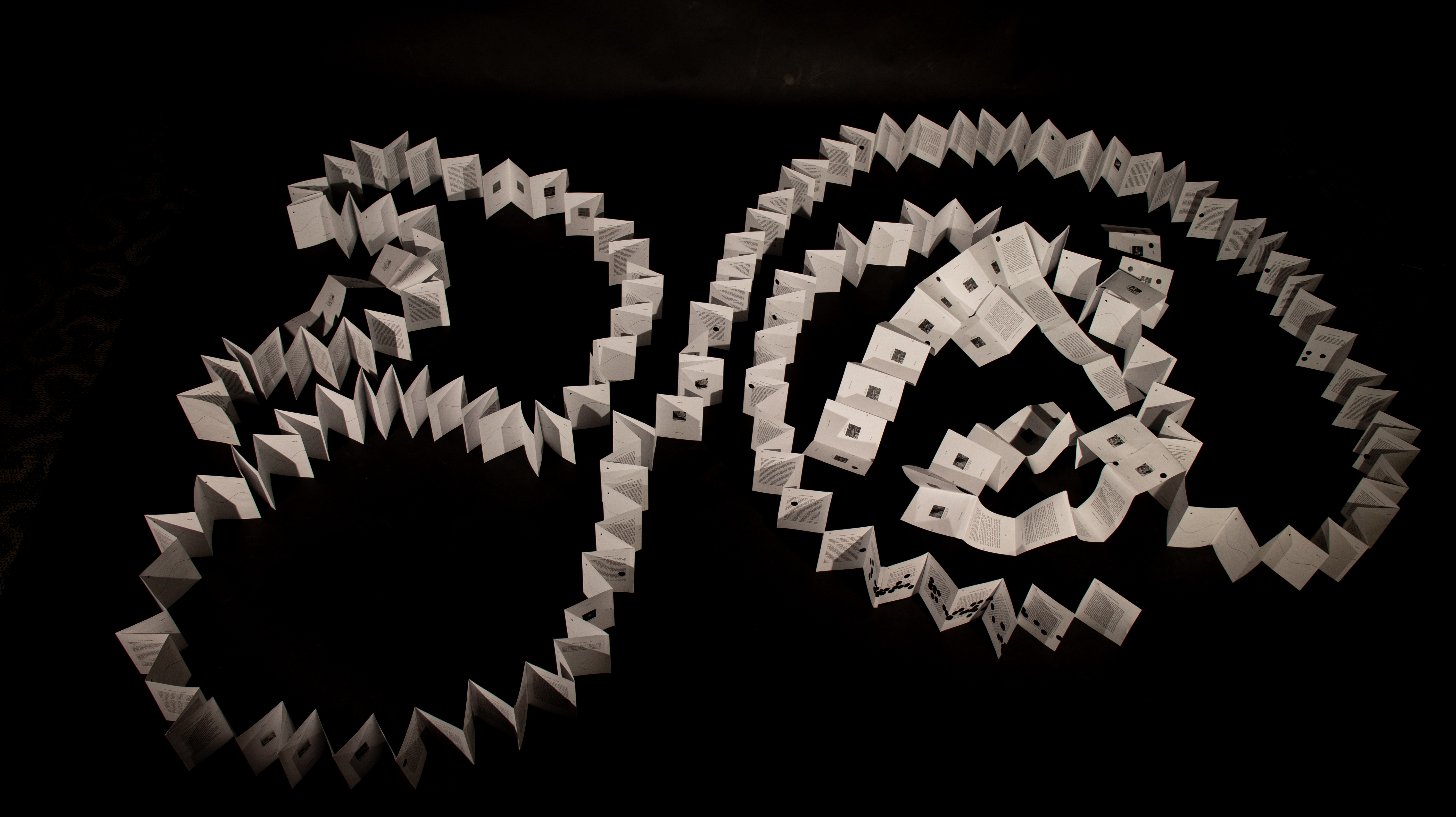 The Eternal Return is a 70+ foot long folded book about the eternal return, recounting historical events during Pluto’s orbits to show how history repeats itself. Its structure is based on the length of Pluto’s orbit (~248 years): one year equals one page.